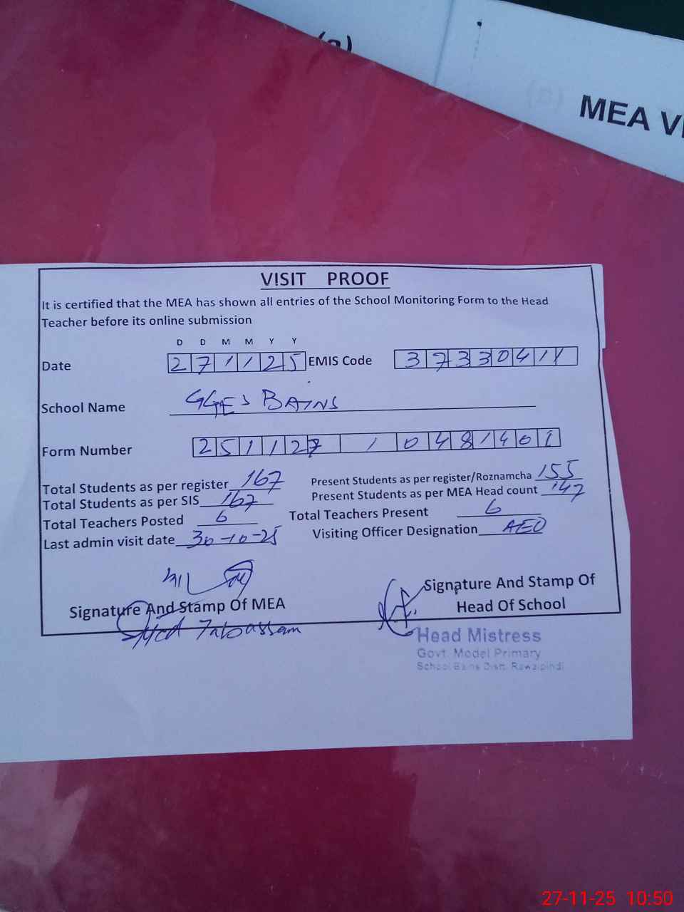 | Attendance Register | Head Teacher | MEA with School | Visit Proof |
