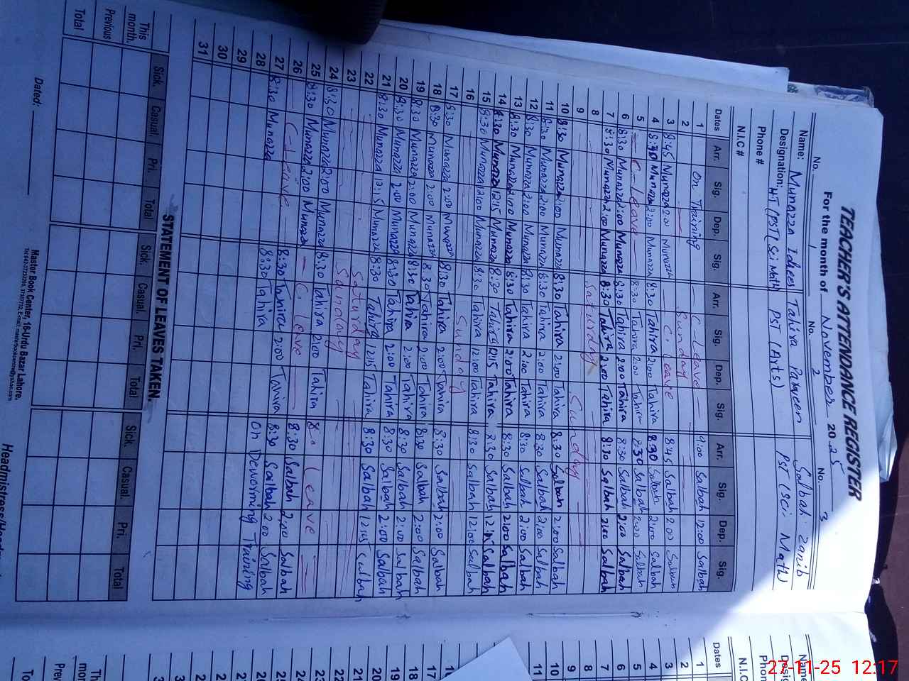 | CNIC | Full Name | Designation | R/C | Absence During Last Calender Month |
