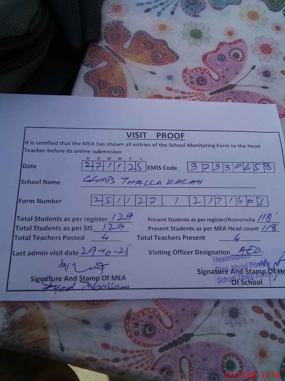 | Attendance Register | Head Teacher | MEA with School | Visit Proof |