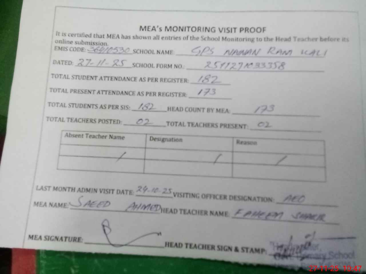 | Attendance Register | Head Teacher | MEA with School | Visit Proof |