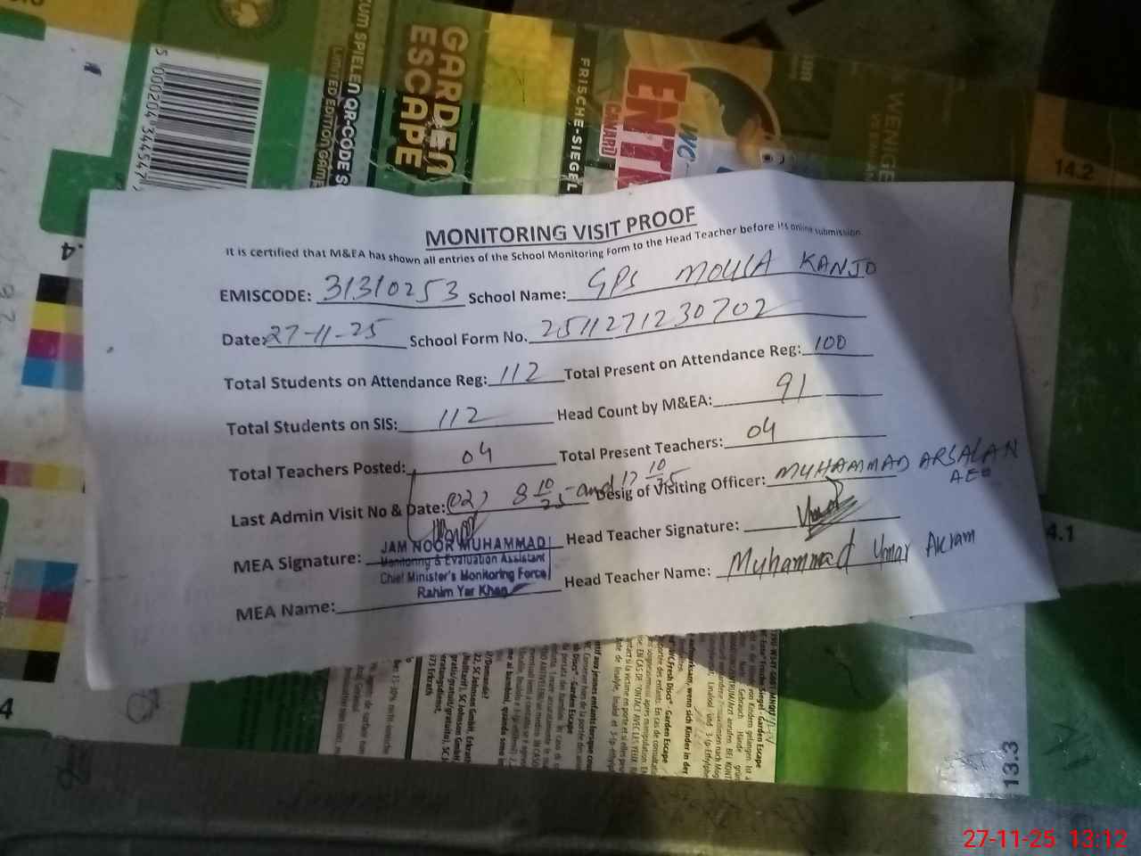 | Attendance Register | Head Teacher | MEA with School | Visit Proof |