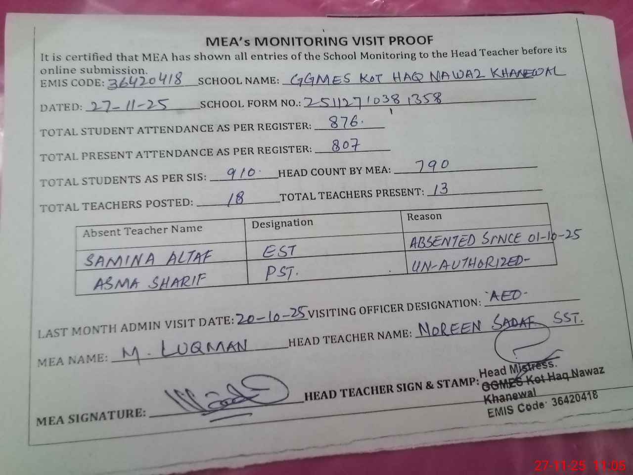 | Attendance Register | Head Teacher | MEA with School | Visit Proof |