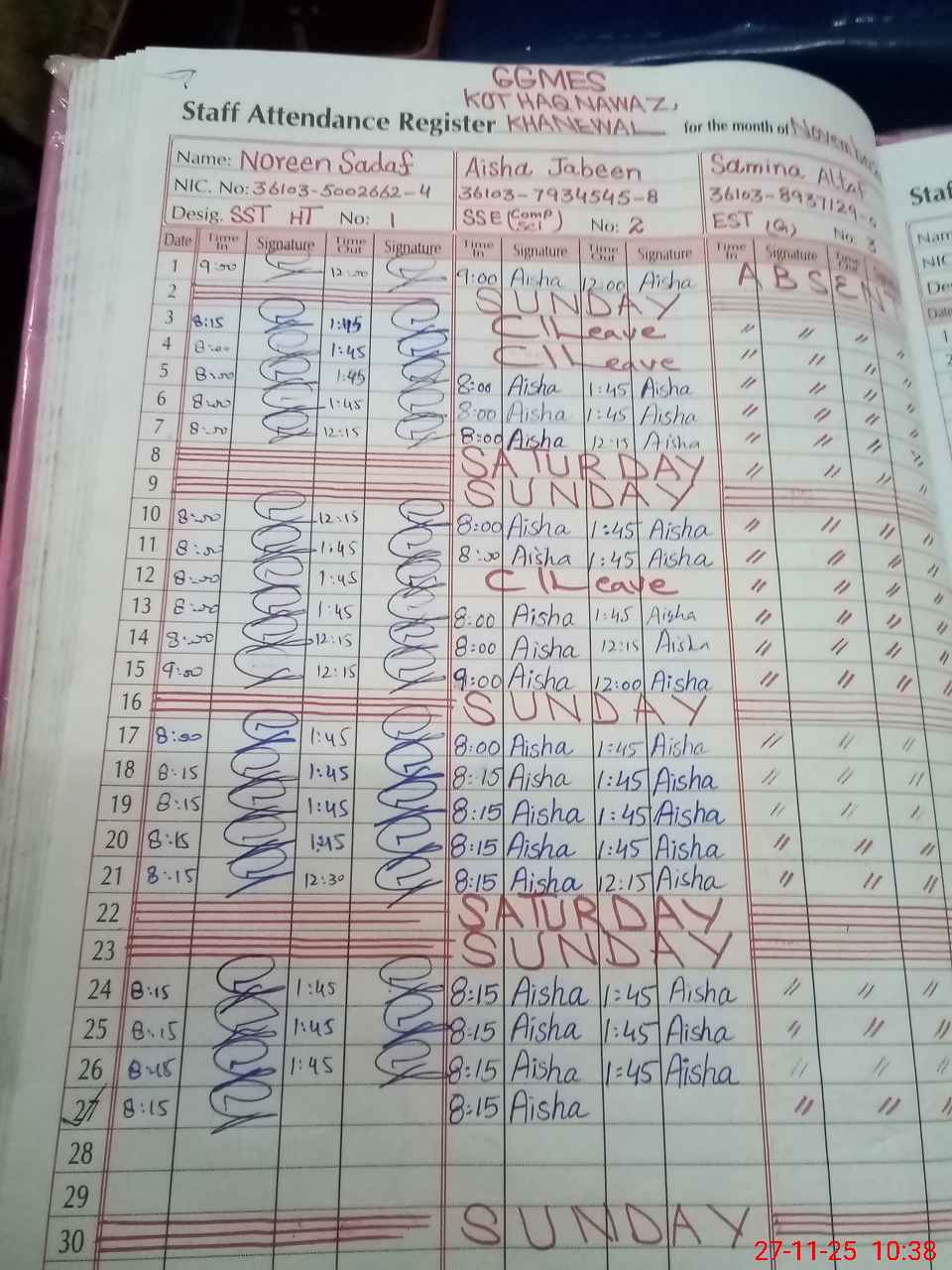 | CNIC | Full Name | Designation | R/C | Absence During Last Calender Month |