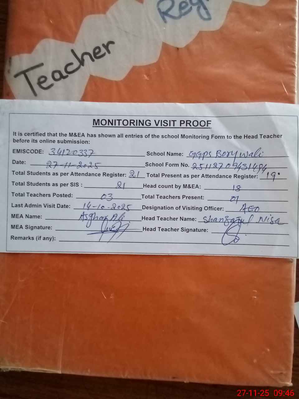 | EMIS Code: 34120337 | Name of School: GGPS BORAY WALI | |||