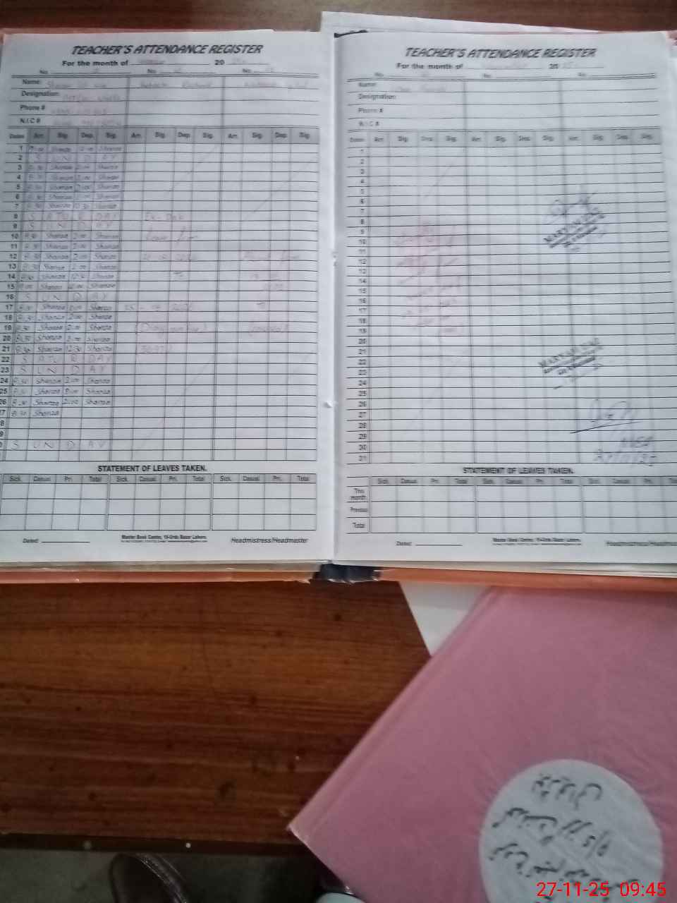 | Remarks (Use Separate Page if Required): Teacher Mahwish Iqbal is absent from duty wef 13 Jan, 2025 and Teacher Uzma Sherazi PST removed from service wef 29 May, 2025 but their names are still showing in the tab. | |||||