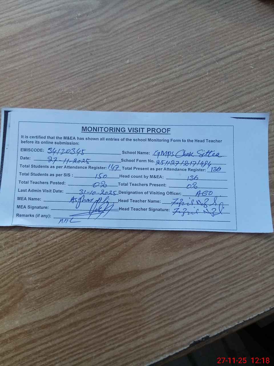 | Attendance Register | Head Teacher | MEA with School | Visit Proof |