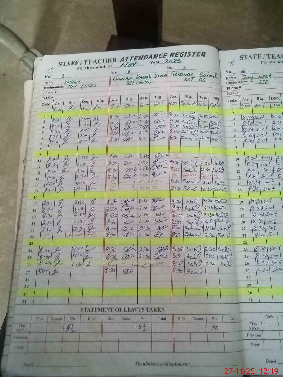 | CNIC | Full Name | Designation | R/C | Absence During Last Calender Month |