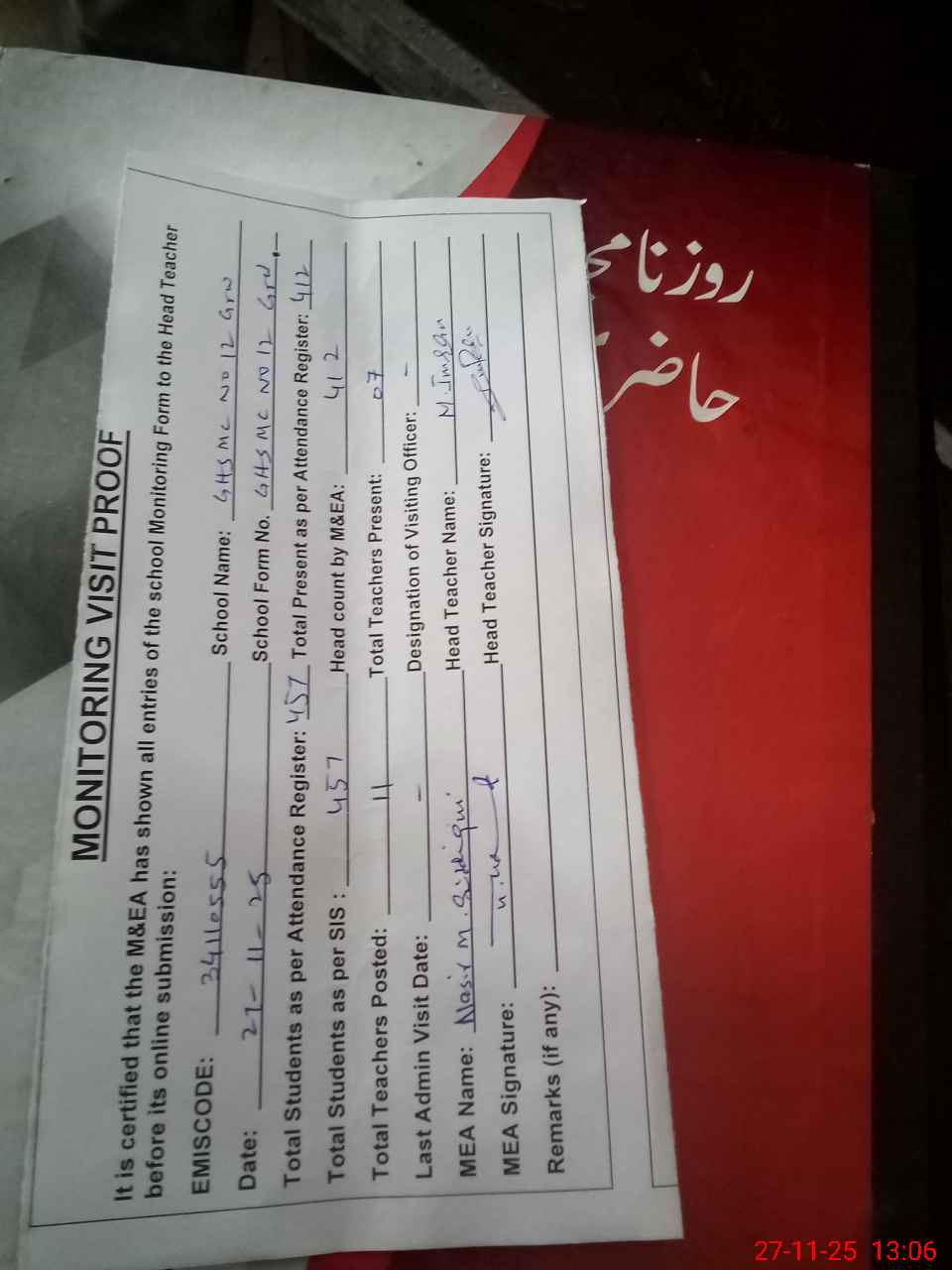 | Attendance Register | Head Teacher | MEA with School | Visit Proof |