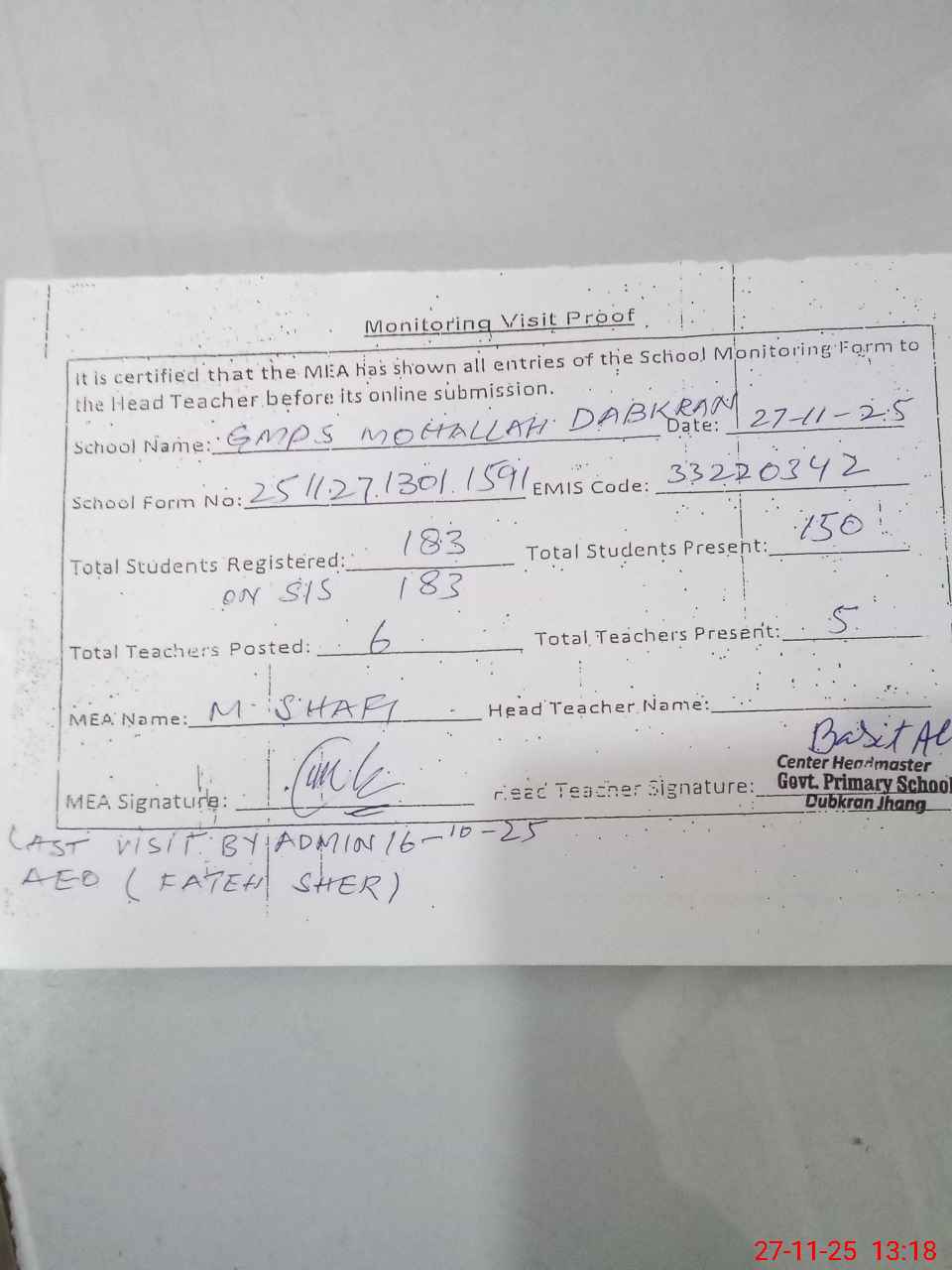 | Attendance Register | Head Teacher | MEA with School | Visit Proof |