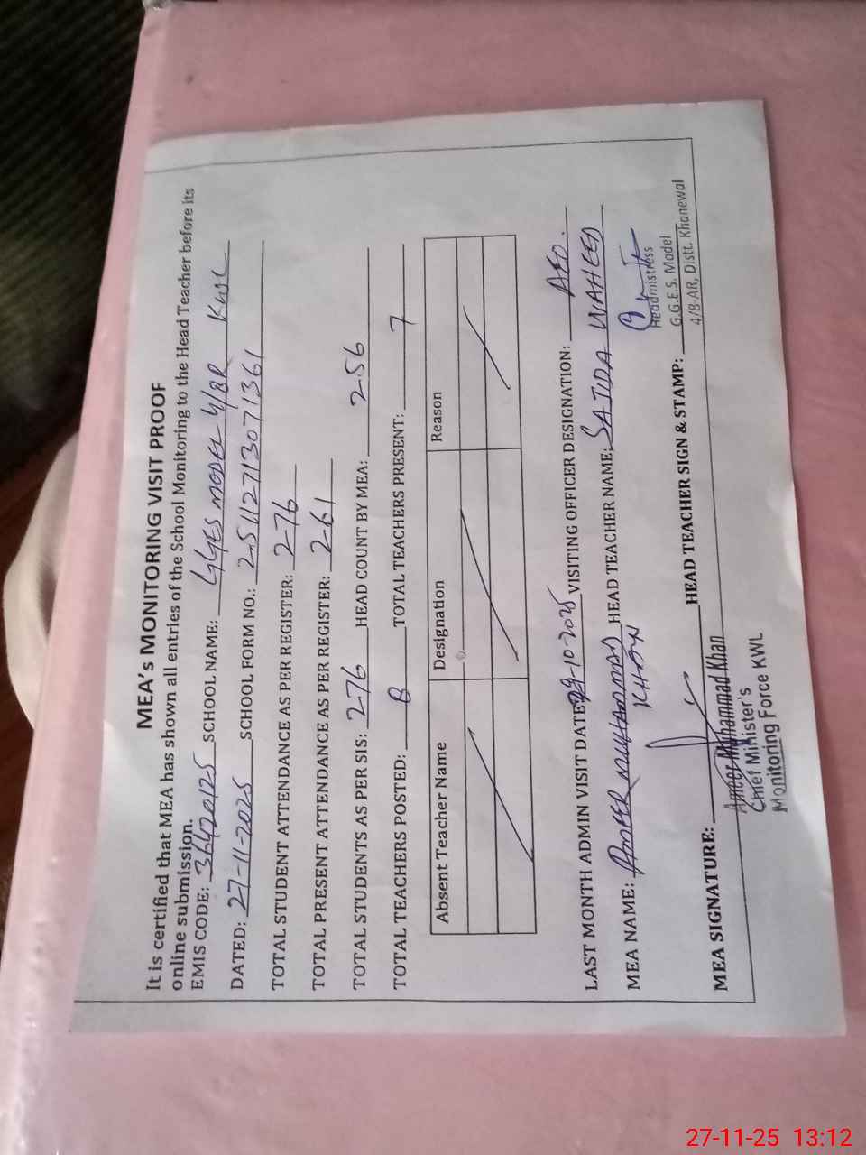 | Attendance Register | Head Teacher | MEA with School | Visit Proof |