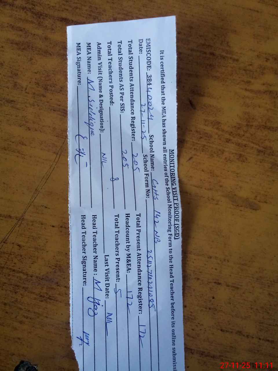| Attendance Register | Head Teacher | MEA with School | Visit Proof |
