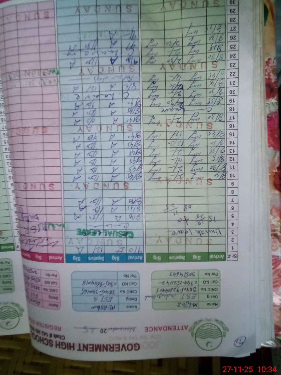 | CNIC | Full Name | Designation | R/C | Absence During Last Calender Month |