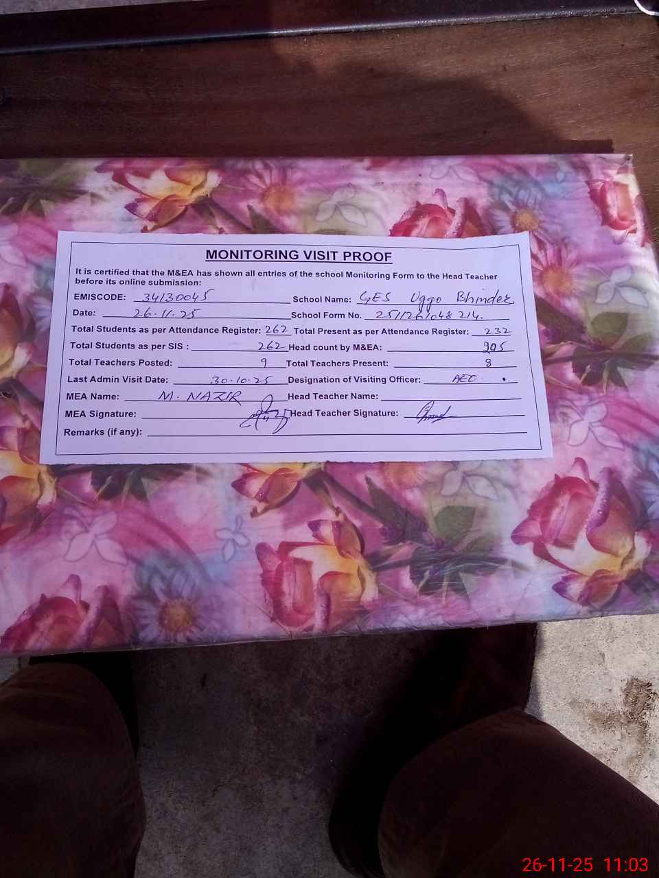 | Attendance Register | Head Teacher | MEA with School | Visit Proof |