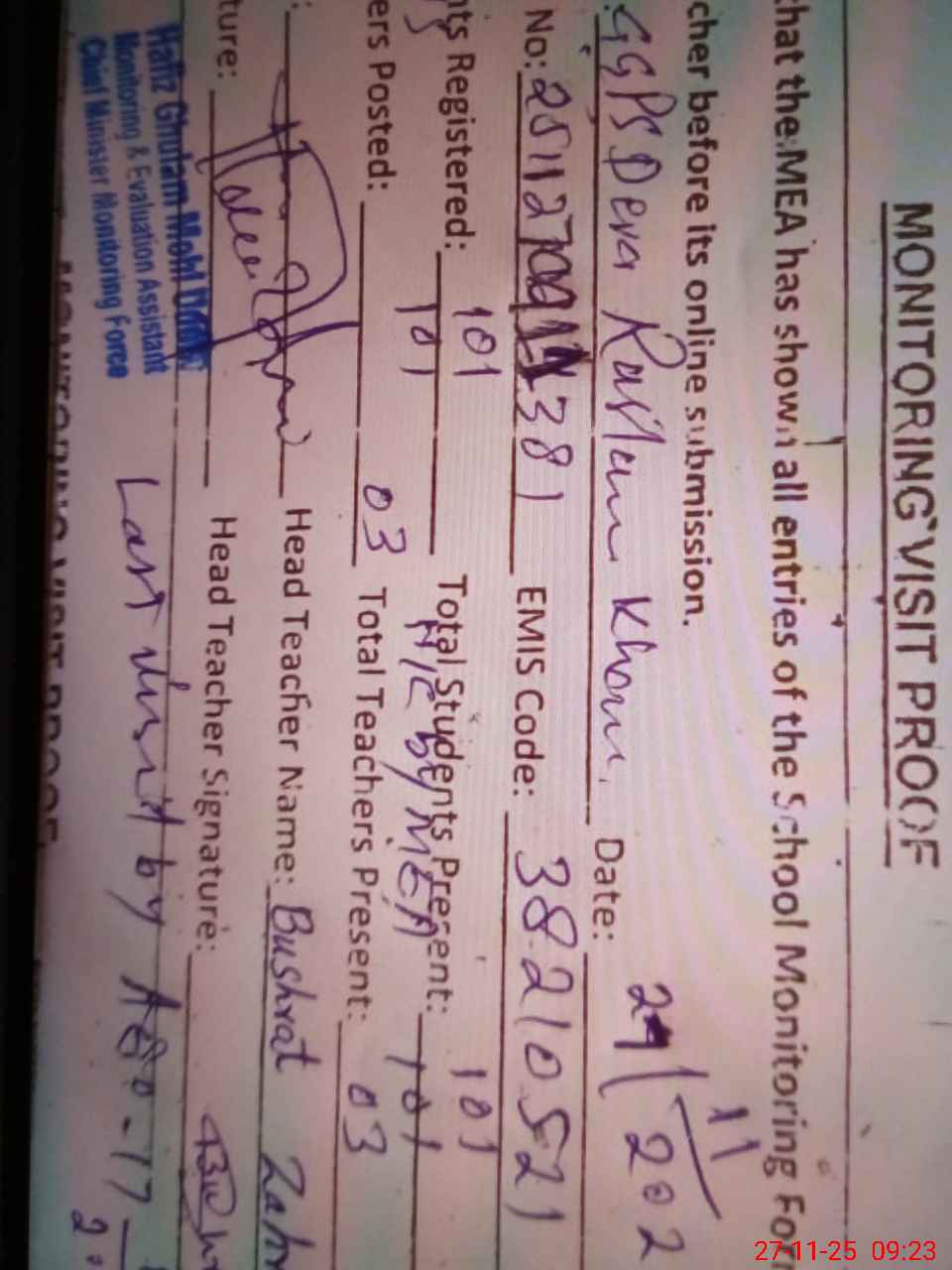 | Attendance Register | Head Teacher | MEA with School | Visit Proof |