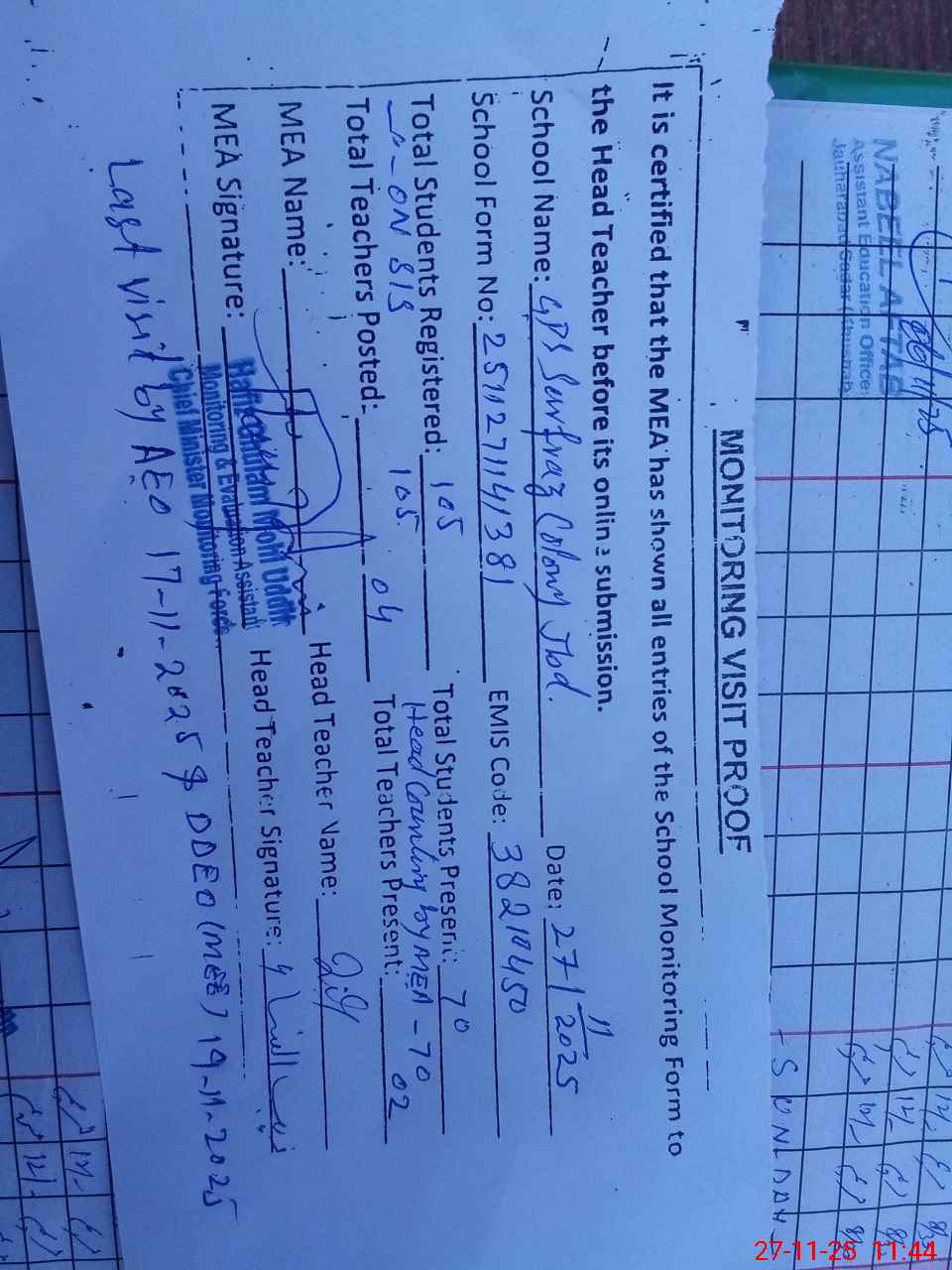 | Attendance Register | Head Teacher | MEA with School | Visit Proof |