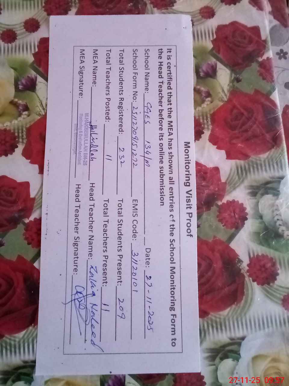 | EMIS Code: 31120101 | Name of School: GGES CHAK NO 134 MURAD | |||