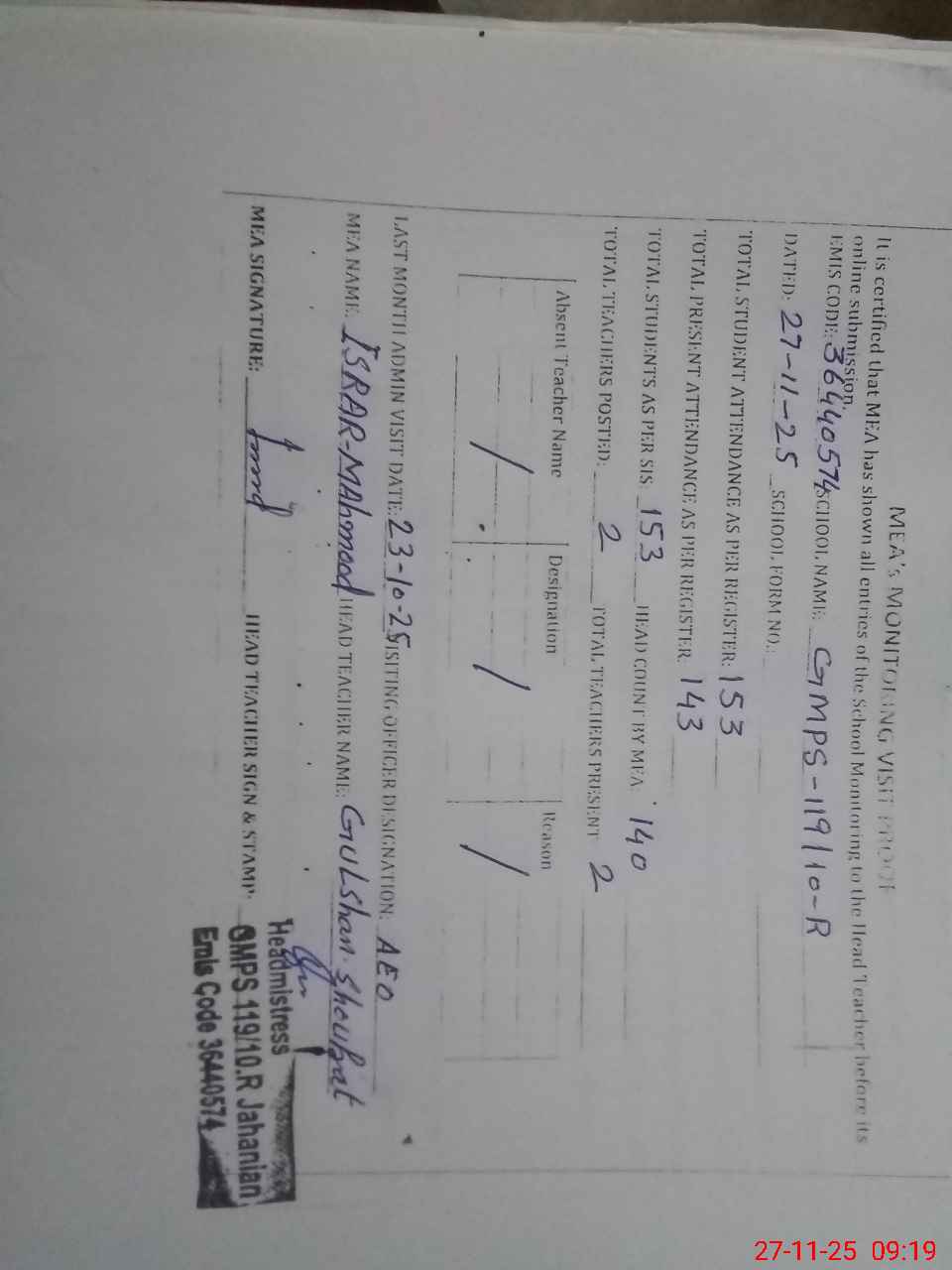 | Attendance Register | Head Teacher | MEA with School | Visit Proof |