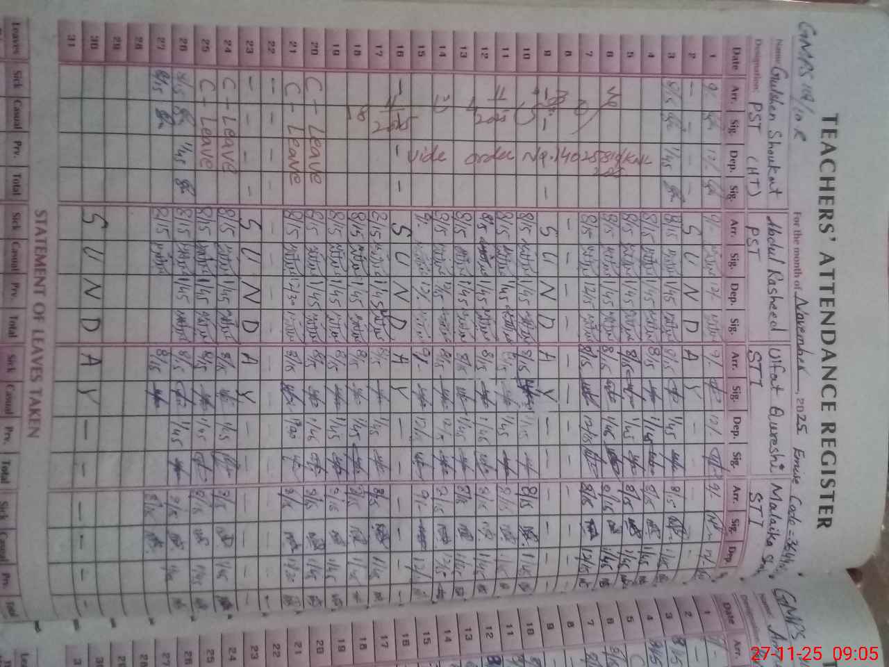 | CNIC | Full Name | Designation | R/C | Absence During Last Calender Month |