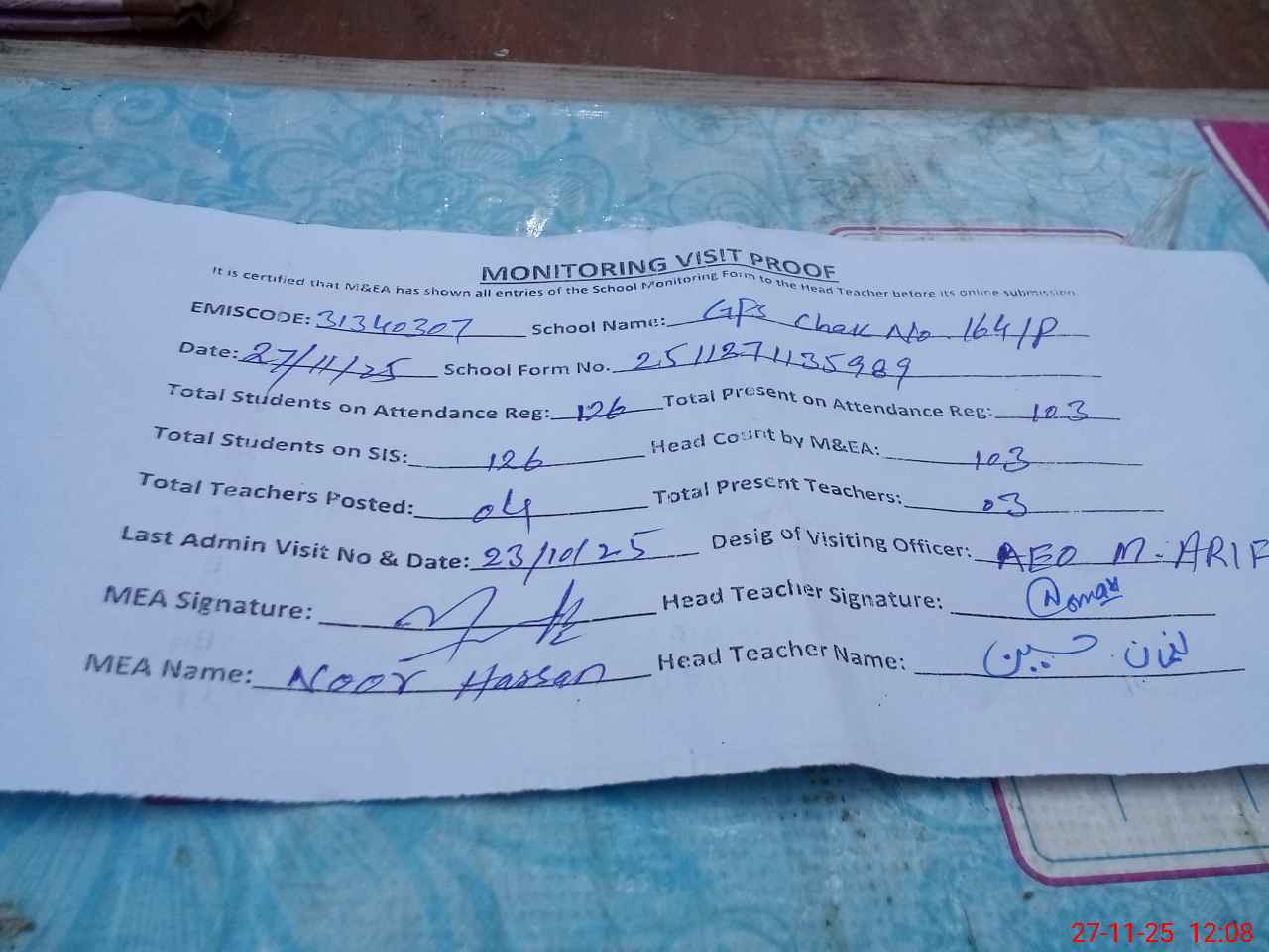 | EMIS Code: 31340307 | Name of School: GPS CHAK NO 164/P | |||