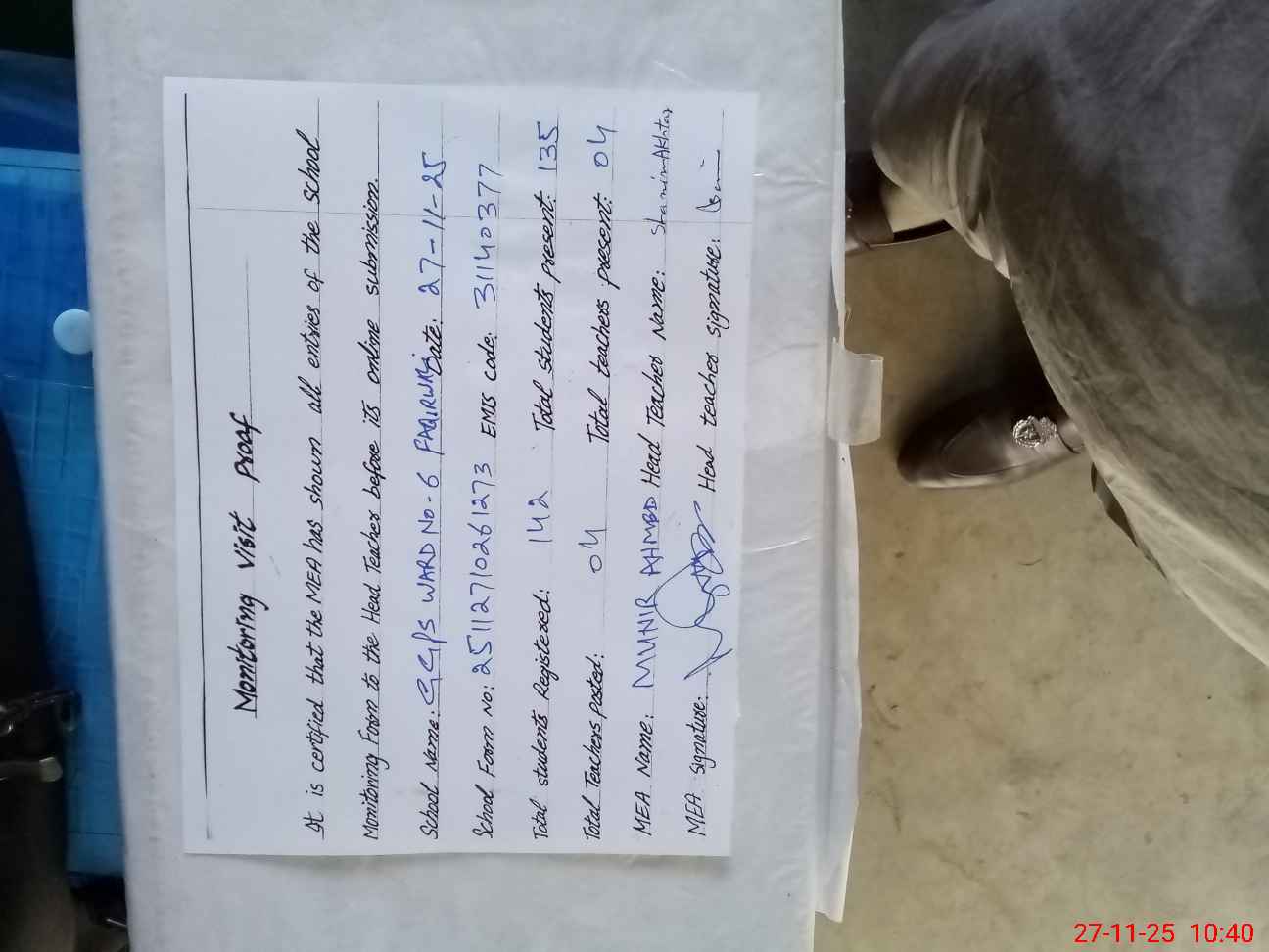 | Attendance Register | Head Teacher | MEA with School | Visit Proof |