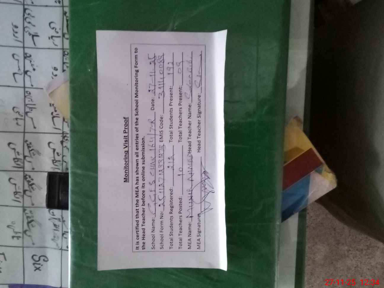 | Attendance Register | Head Teacher | MEA with School | Visit Proof |