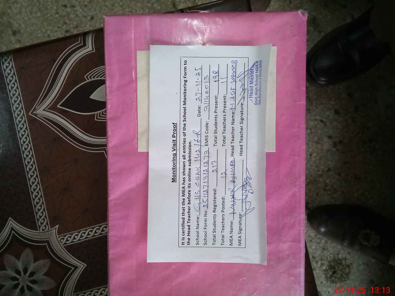 | Attendance Register | Head Teacher | MEA with School | Visit Proof |