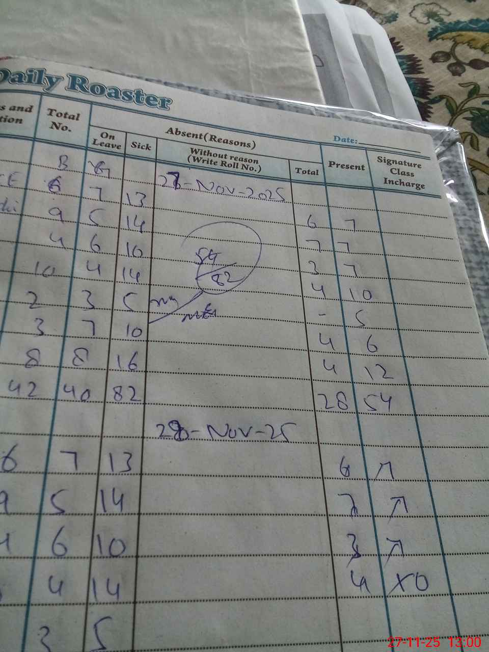 | No. of Students Present - Male | 0 | 3 | 1 | 7 | 2 | 2 | 6 | 26 | ||||||||