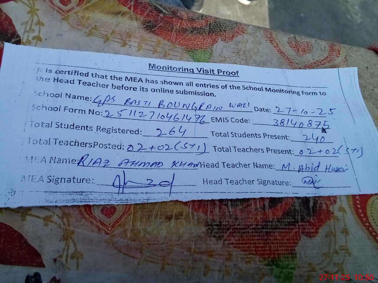 | Attendance Register | Head Teacher | MEA with School | Visit Proof |