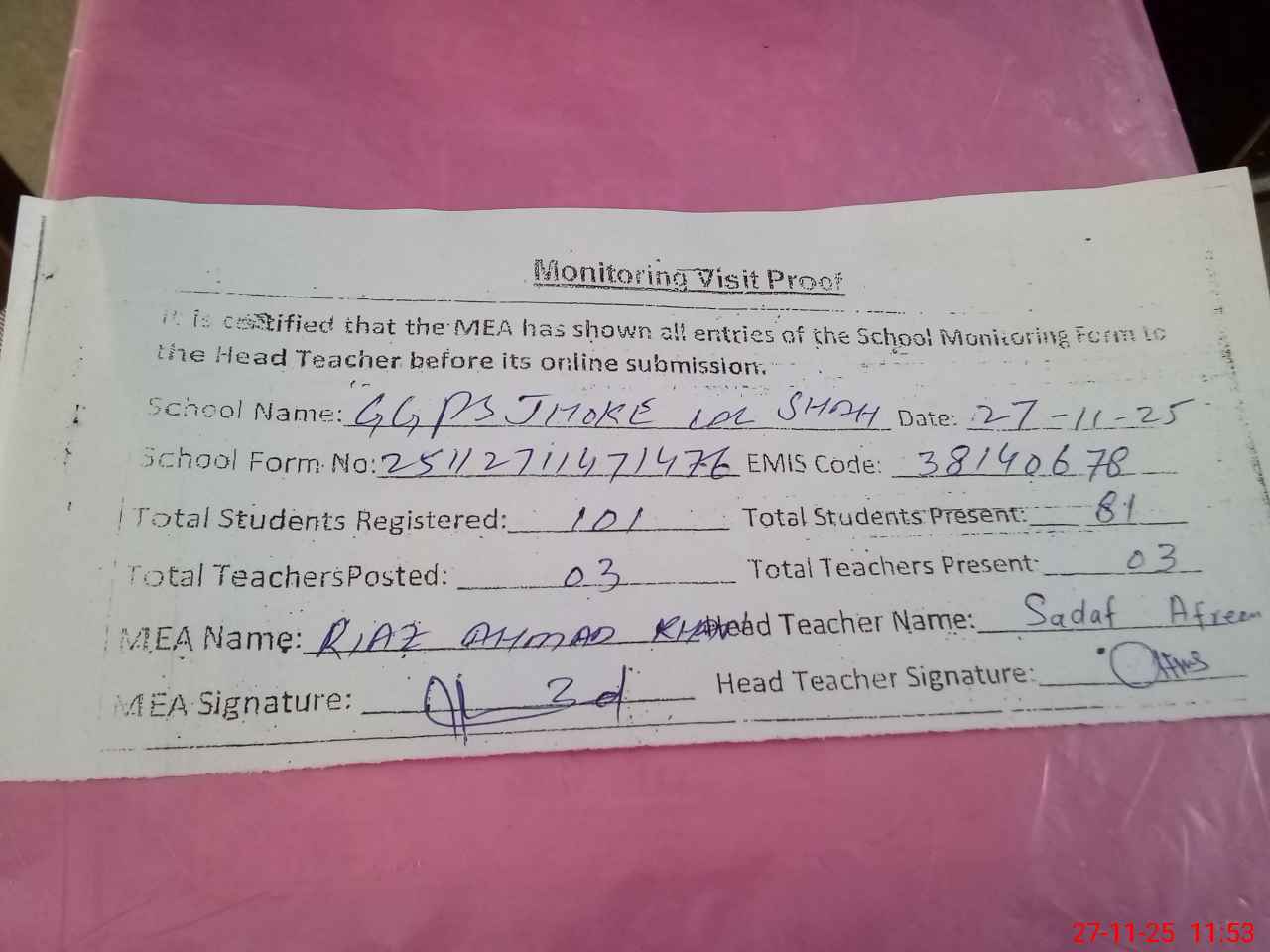 | Attendance Register | Head Teacher | MEA with School | Visit Proof |