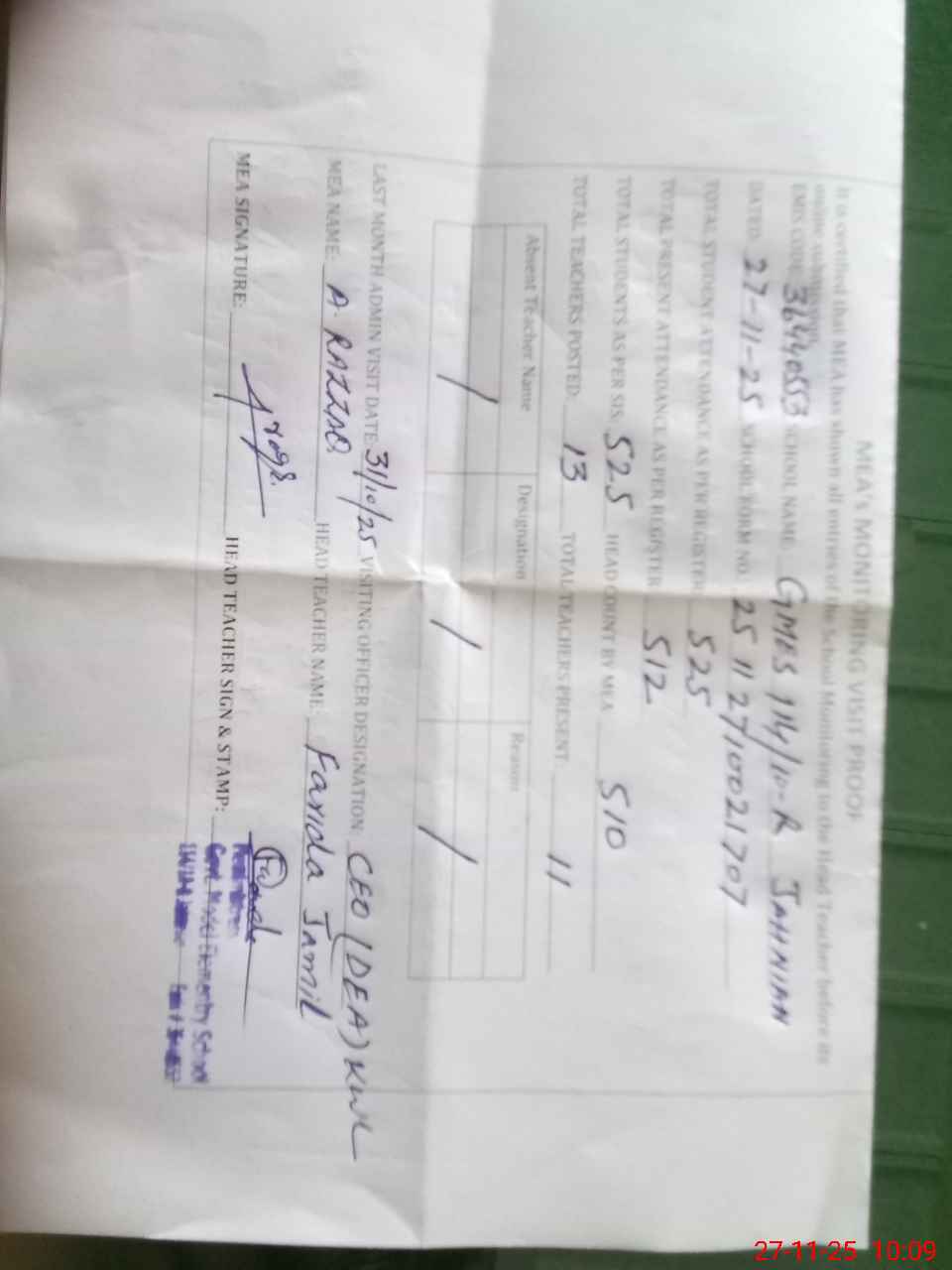 | Attendance Register | Head Teacher | MEA with School | Visit Proof |