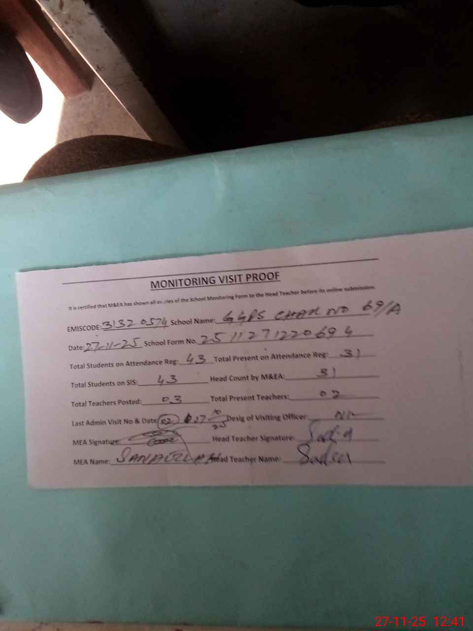 | Attendance Register | Head Teacher | MEA with School | Visit Proof |