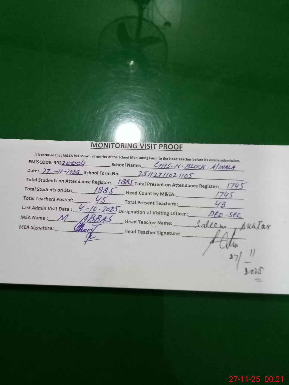 | Attendance Register | Head Teacher | MEA with School | Visit Proof |