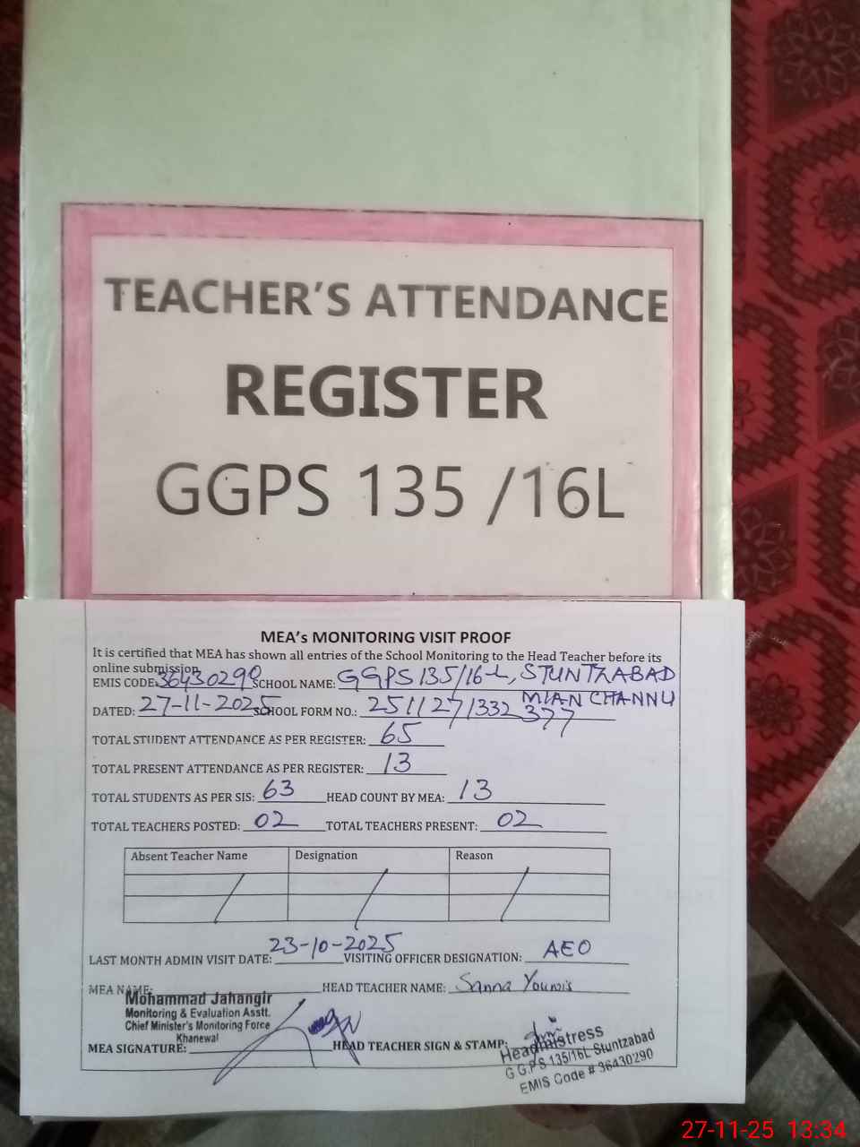 | Attendance Register | Head Teacher | MEA with School | Visit Proof |