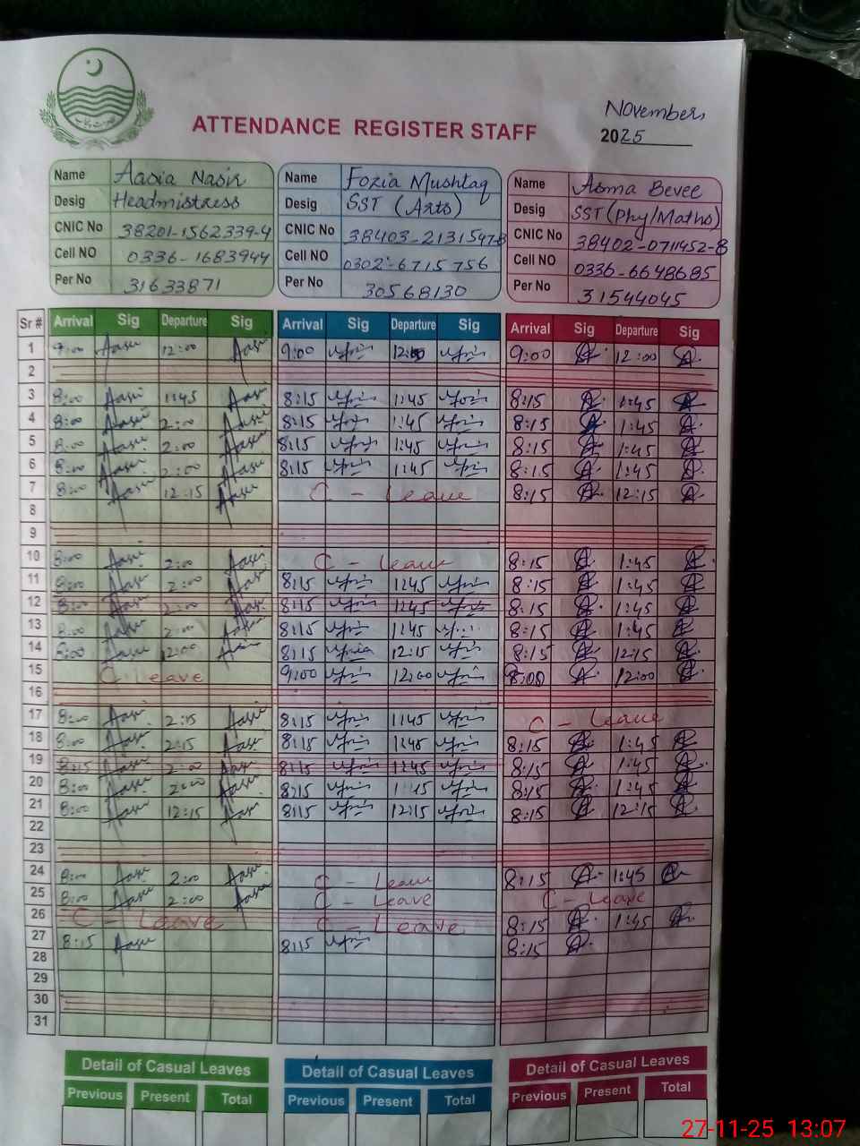| CNIC | Full Name | Designation | R/C | Absence during last cal. month |