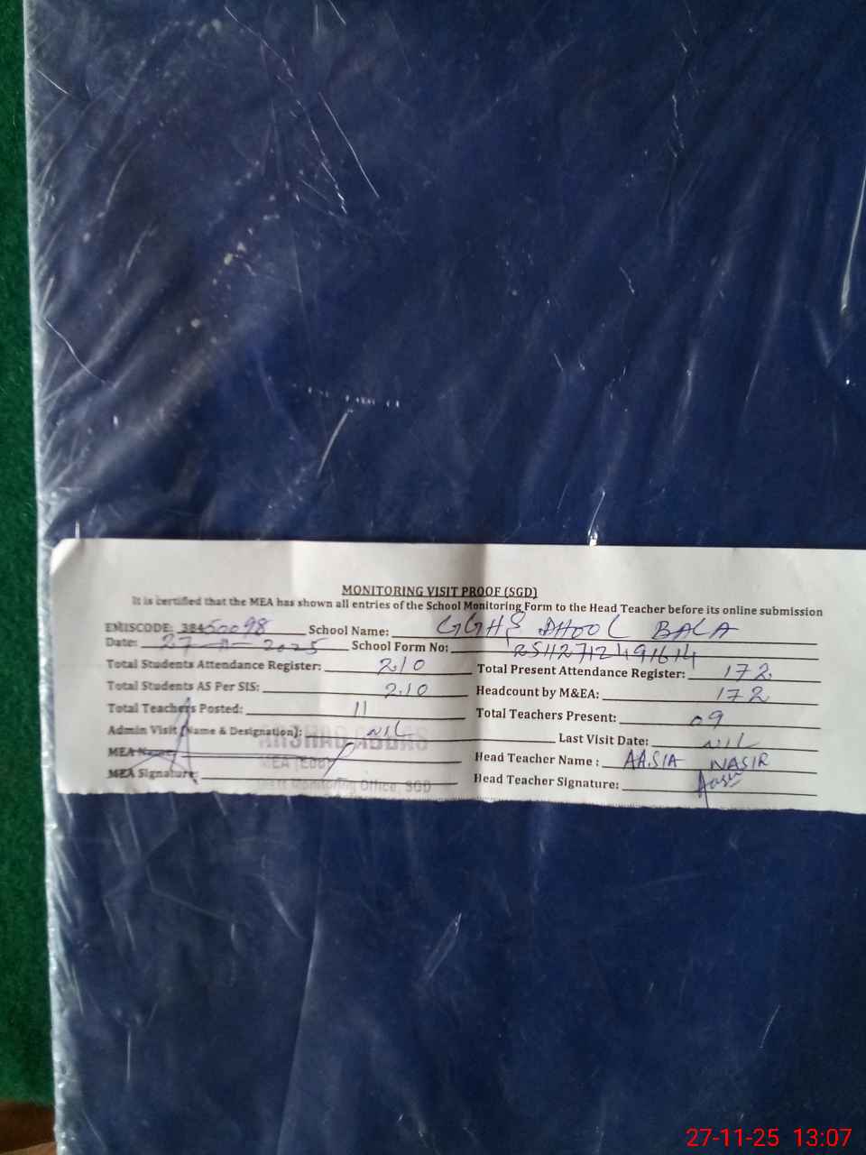 | Attendance Register | Head Teacher | MEA with School | Visit Proof |