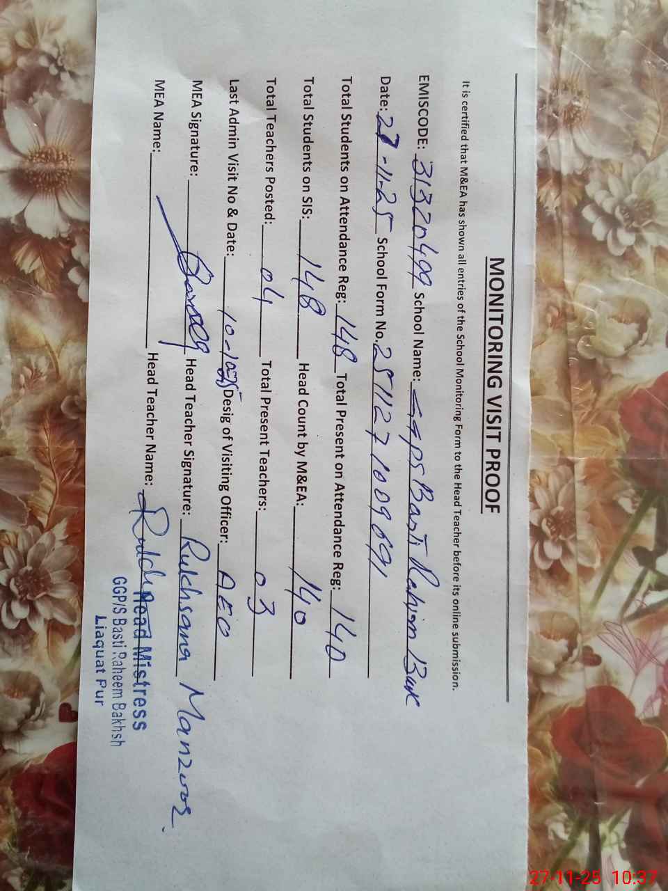 | Attendance Register | Head Teacher | MEA with School | Visit Proof |