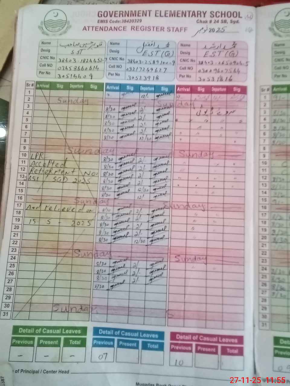 | CNIC | Full Name | Designation | R/C | Absence During Last Calender Month |