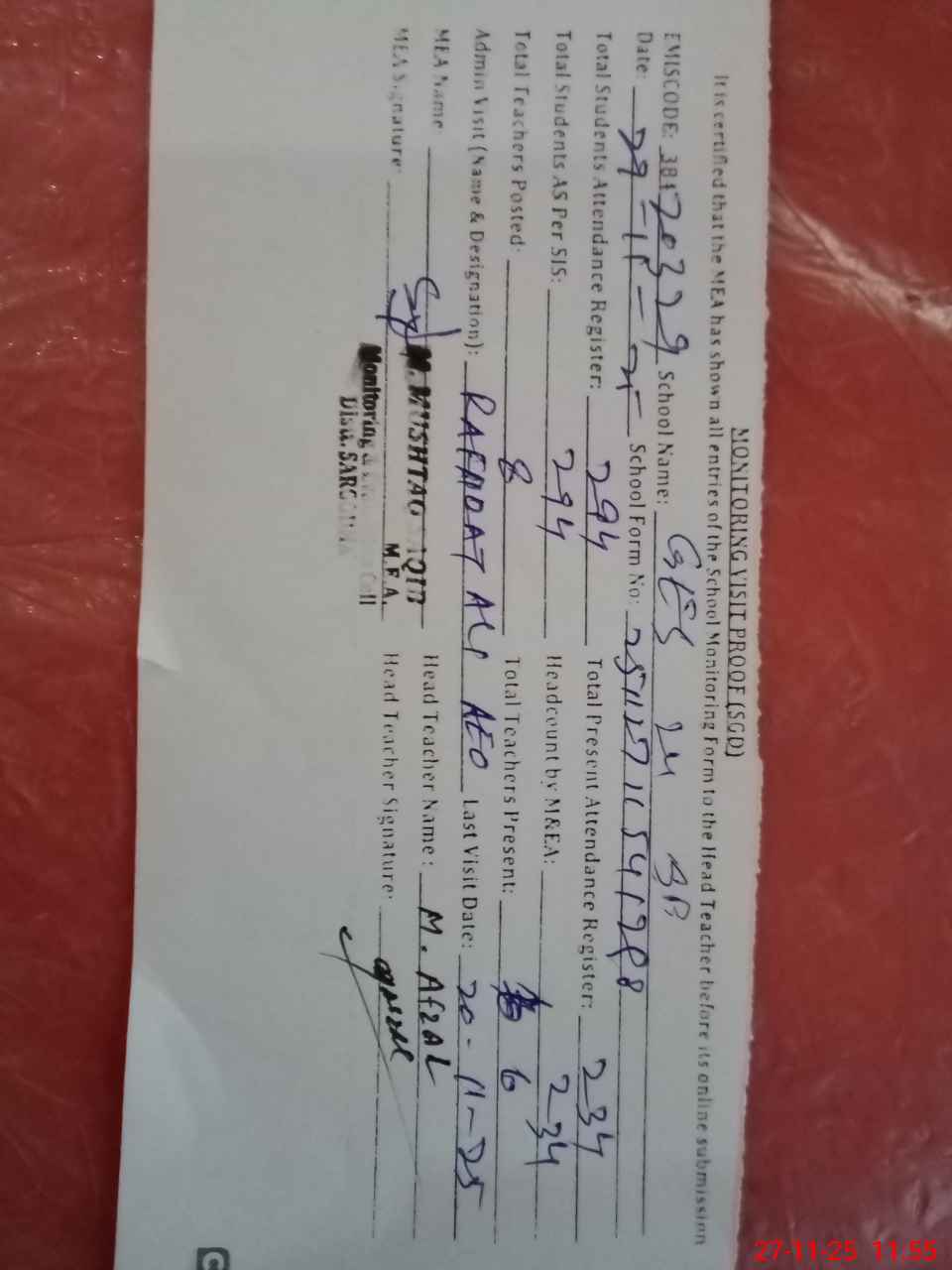 | Attendance Register | Head Teacher | MEA with School | Visit Proof |