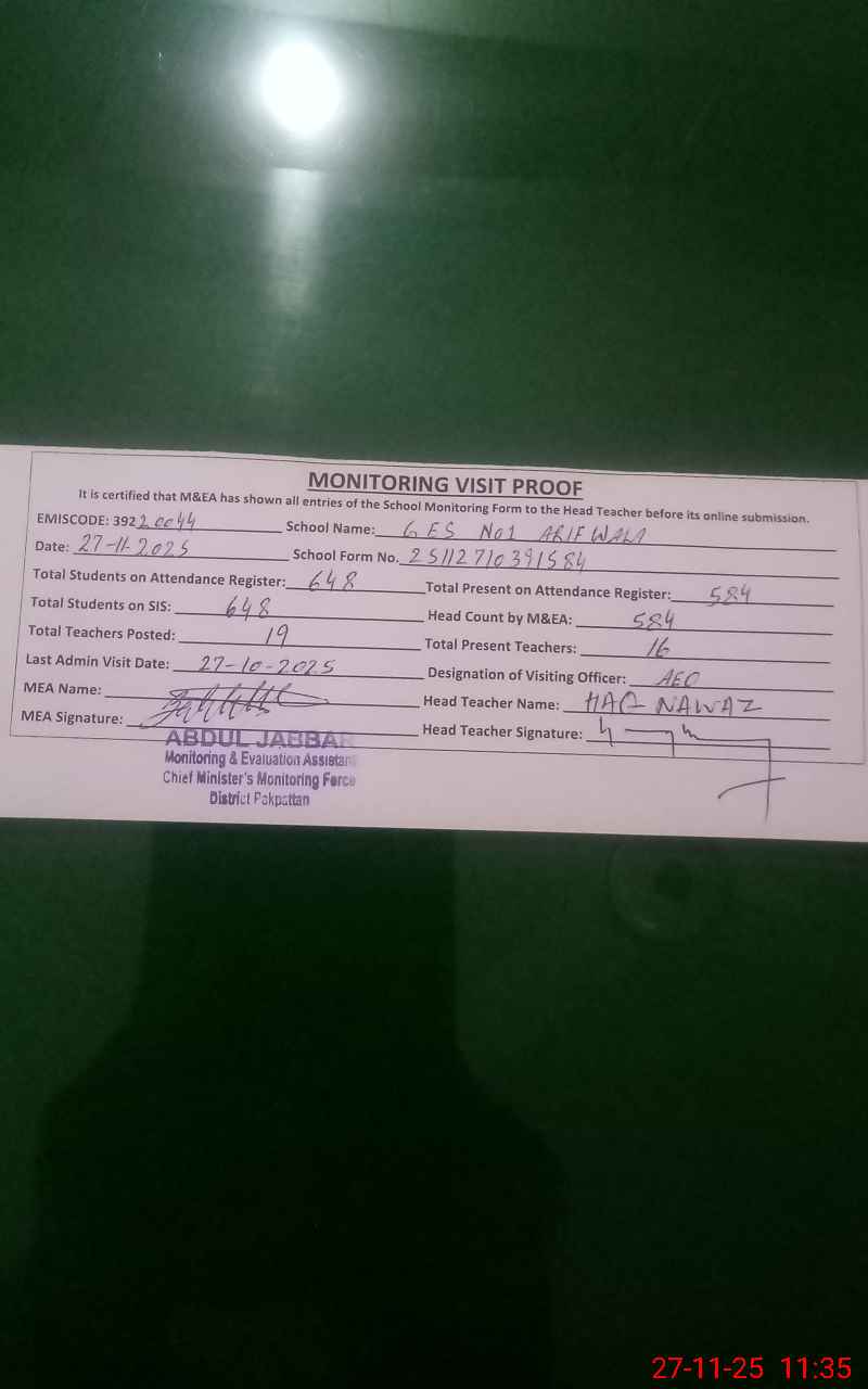 | EMIS Code: 39220044 | Name of School: GES NO. 1 ARIF WALA | |||