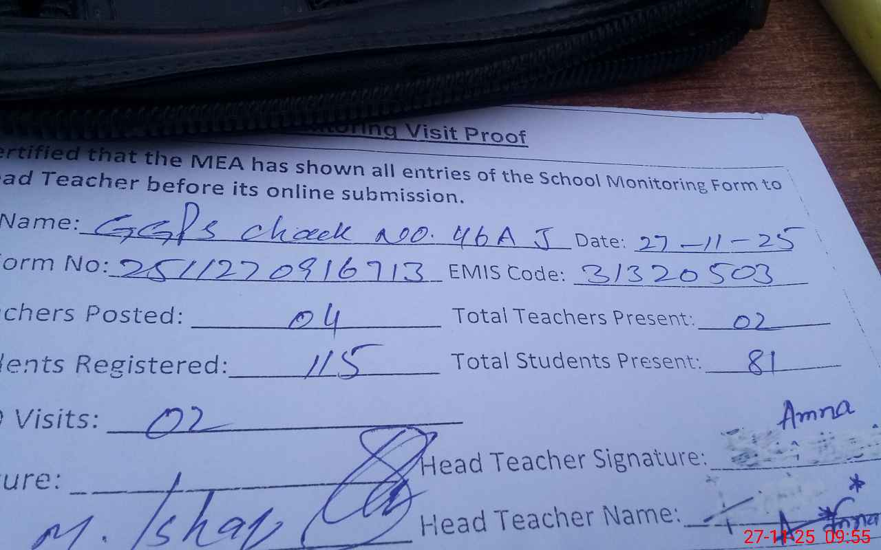 | Attendance Register | Head Teacher | MEA with School | Visit Proof |