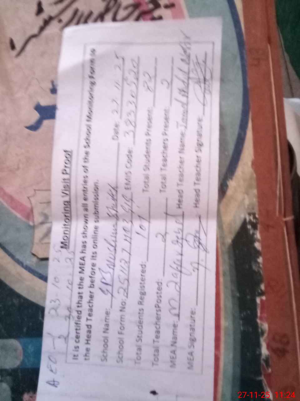| Attendance Register | Head Teacher | MEA with School | Visit Proof |
