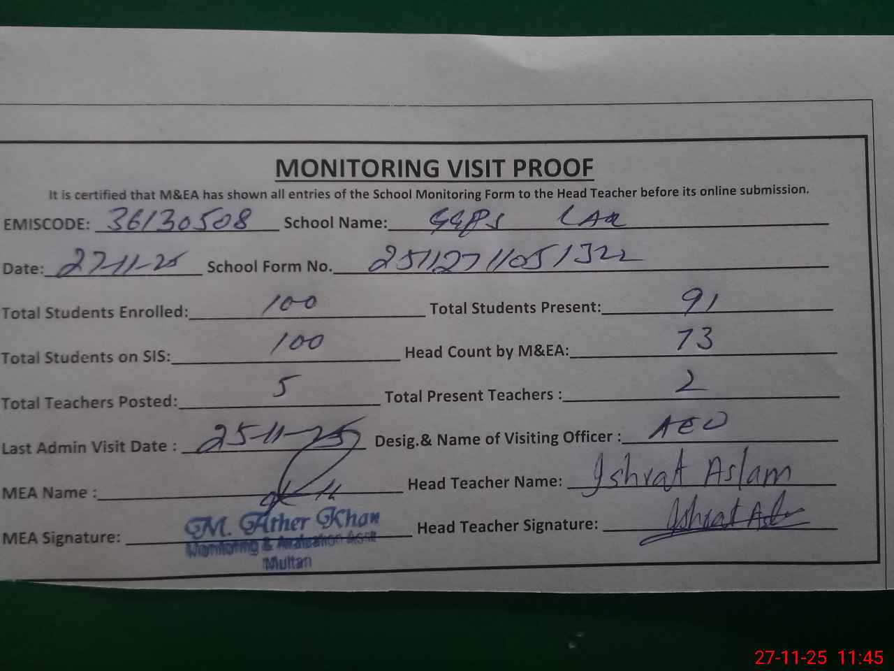 | Attendance Register | Head Teacher | MEA with School | Visit Proof |