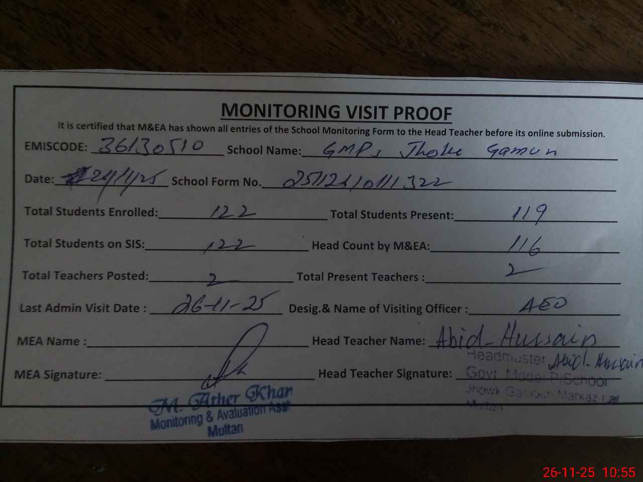 | Monitoring Date: 26-11-2025 | Start Time: 26-11-2025 10:11 AM | End Time: 26-11-2025 10:57 AM | Name of MEA: MU**** AT**** KH**** | |