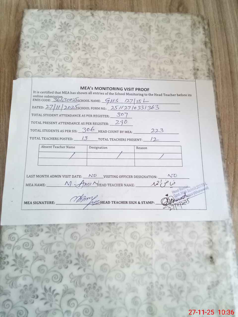 | EMIS Code: 36430025 | Name of School: GHS 127/15-L, MIAN CHANNU | |||