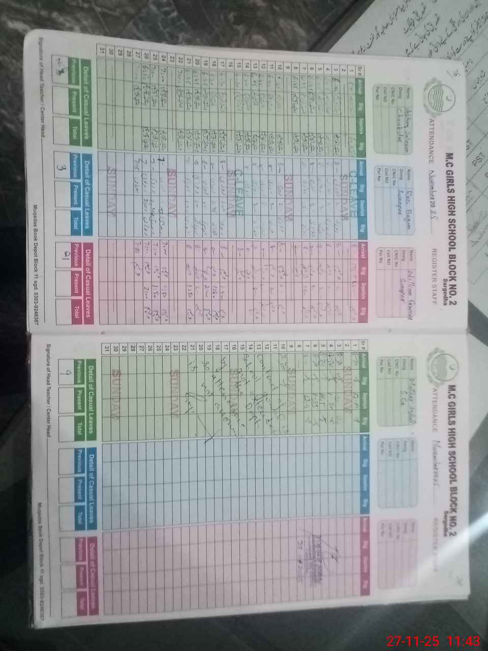 | CNIC | Full Name | Designation | R/C | Absence During Last Calender Month |