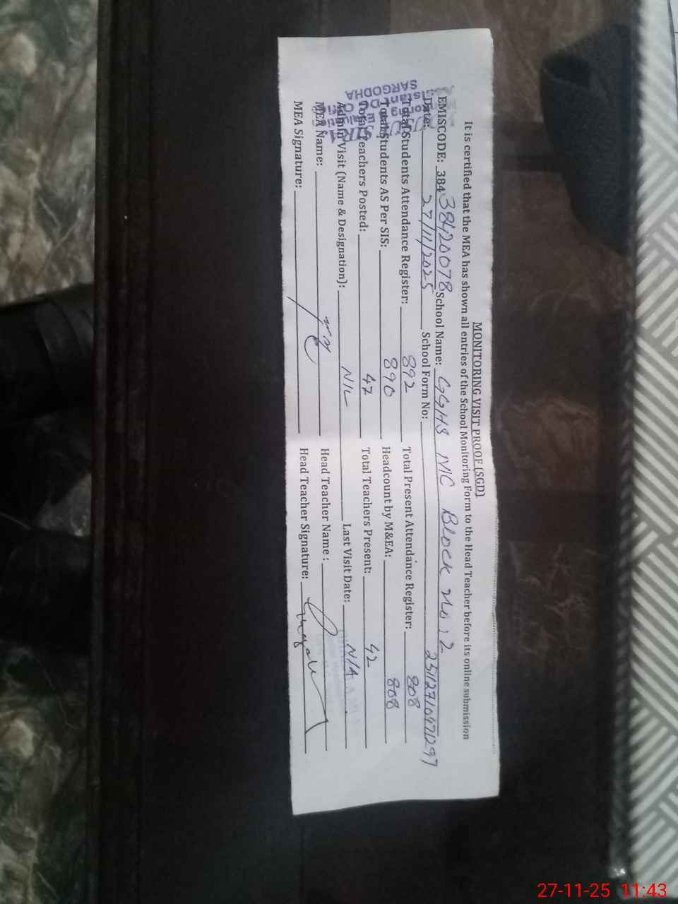 | Attendance Register | Head Teacher | MEA with School | Visit Proof |