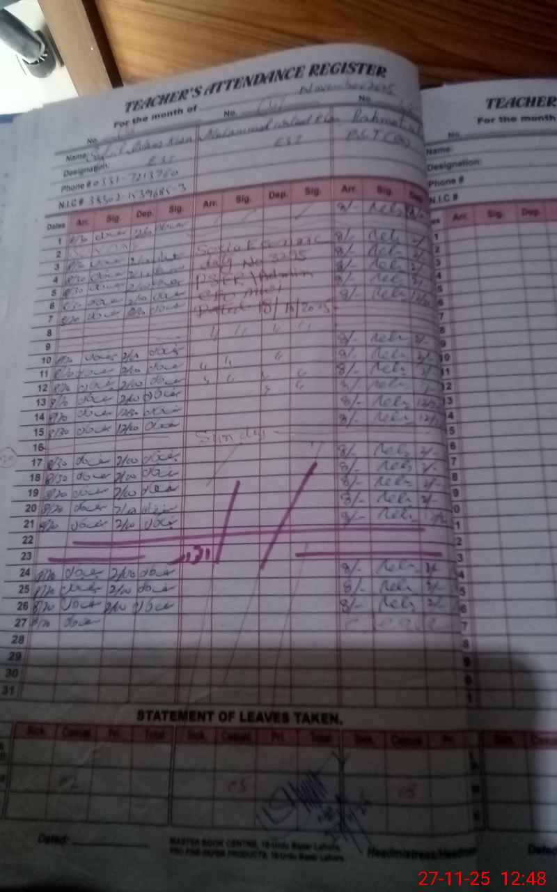 | CNIC | Full Name | Designation | R/C | Absence During Last Calender Month |