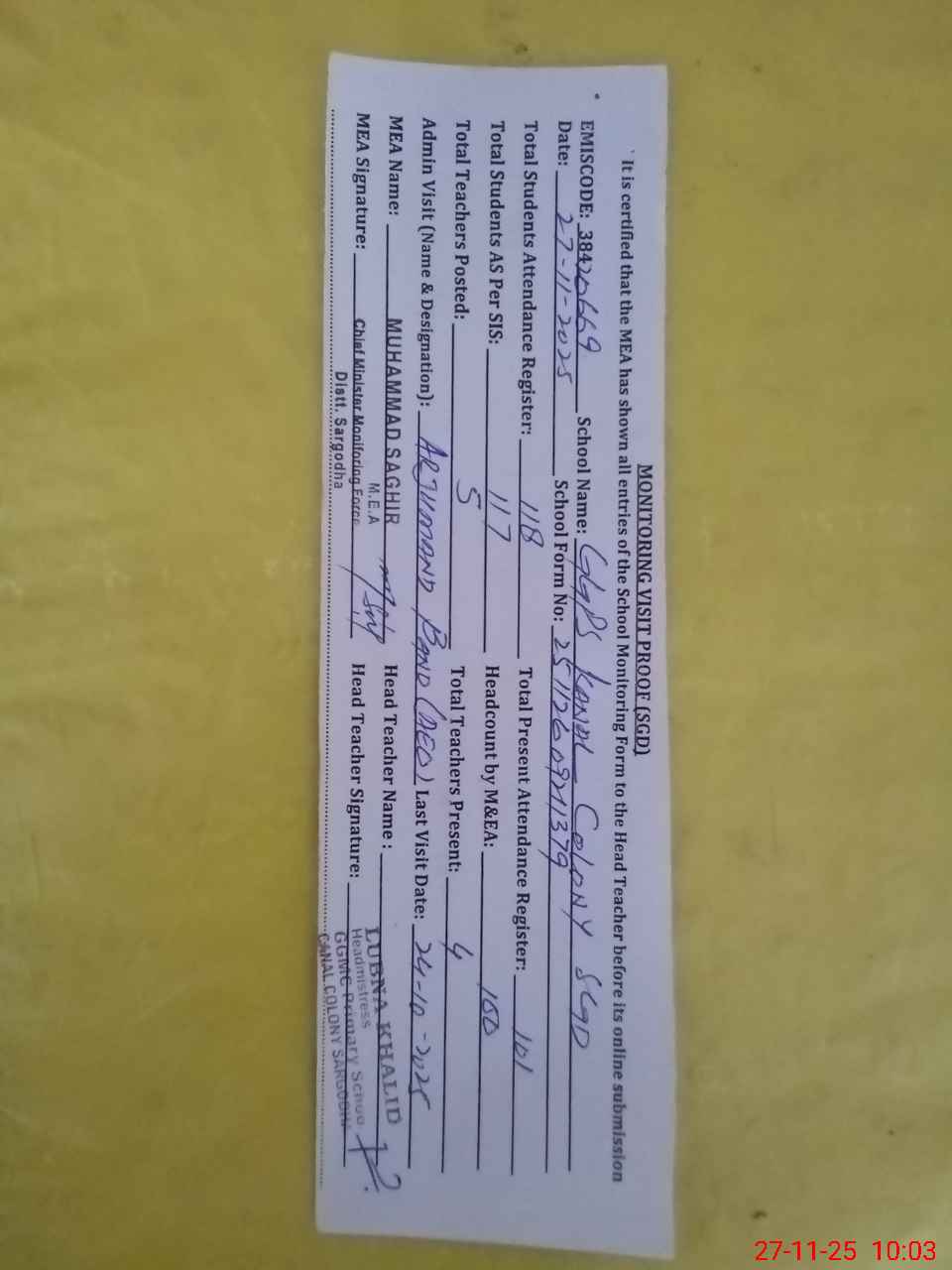 | EMIS Code: 38420669 | Name of School: GGPS MC KANAL COLONY SARGODHA | |||