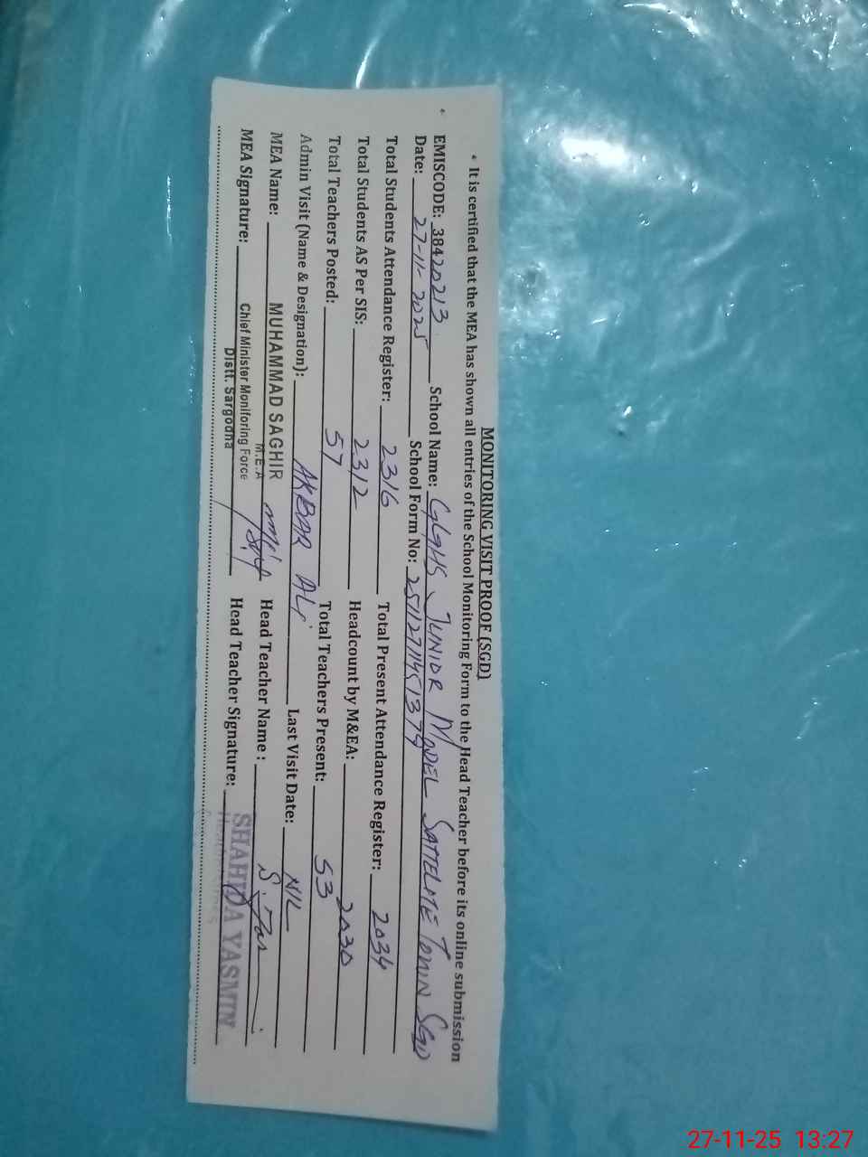 | Attendance Register | Head Teacher | MEA with School | Visit Proof |