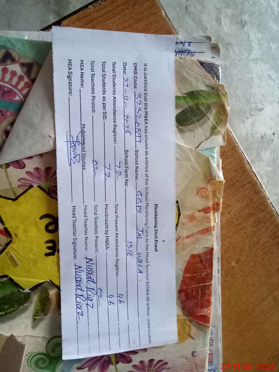 | Attendance Register | Head Teacher | MEA with School | Visit Proof |